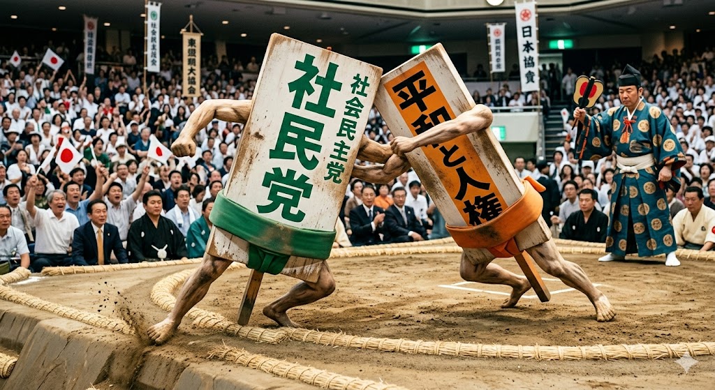 「一ミリも関係ないわ。ただの名前被りよ。というわけで、今日は『どすこい社民党はこのままどうなるのか?』というテーマで、日本の国家システムと政党のバグについて解析していくわ。」